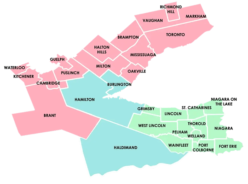 Photography, video, virtual tours, and drone services are available across Niagara, Hamilton, Burlington. and Haldimand. Service to nearby regions (highlighted in light red on the map) may be available on request.